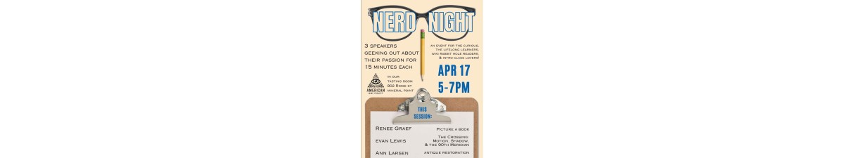 3 SPEAKERS GEEKING OUT ABOUT THEIR PASSION FOR 15 MINUTES EACH AN EVENT FOR THE CURIOUS, THE LIFELONG LEARNERS, WIKI RABBIT HOLE READERS, & INTRO CLASS LOVERS! RENEE GRAEF - PICTURE A BOOK EVAN LEWIS - THE CROSSING: MOTION, SHAdOW, & THE 90TH MERIDIAN ANN LARSEN - ANTIQUE RESTORATION